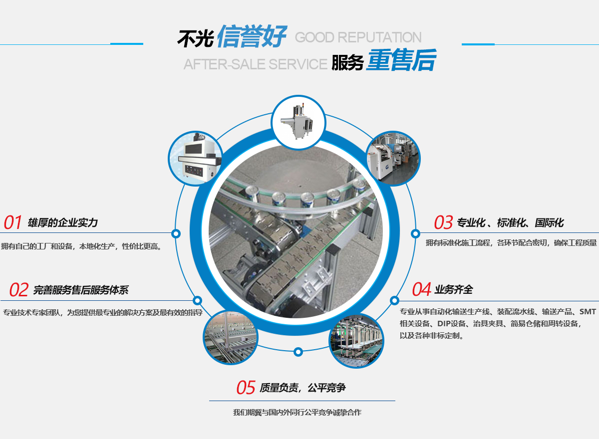 我公司致力于電子、工業(yè)新技術推動的新產(chǎn)品工藝的設備配套,專業(yè)從事自動化輸送生產(chǎn)線、裝配流水線、輸送產(chǎn)品、SMT相關設備、DIP設備、治具夾具、簡易倉儲和周轉設備,以及各種非標定制.....